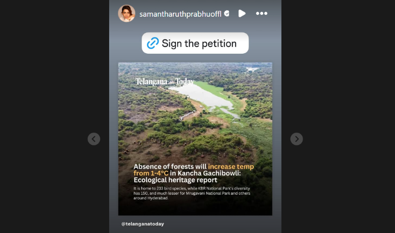 Samantha shared a Telangana Today report on her Instagram handle and requested the users to sign the petition to back the protests against the deforestation.