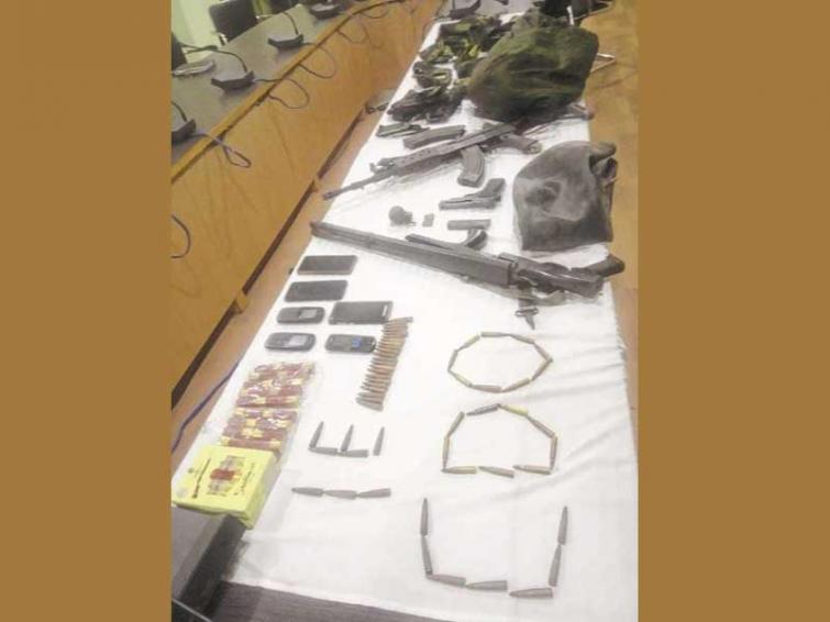 Security personnel had recovered one AK series HK Rifle with two numbers of magazines, 36 numbers of live rounds of HK Rifle, a 9 mm pistol with one magazine, four live rounds of 9mm pistol, 19 numbers of M16 rifle ammunition, one double barrel gun with 20 live rounds, one Chinese made hand grenade, military jungle boot and camouflage fighting dresses in possession from them and also seized a smoke grey Maruti Swift car, bearing the registration number AS-01 MA-8150.