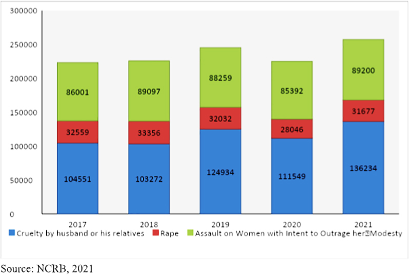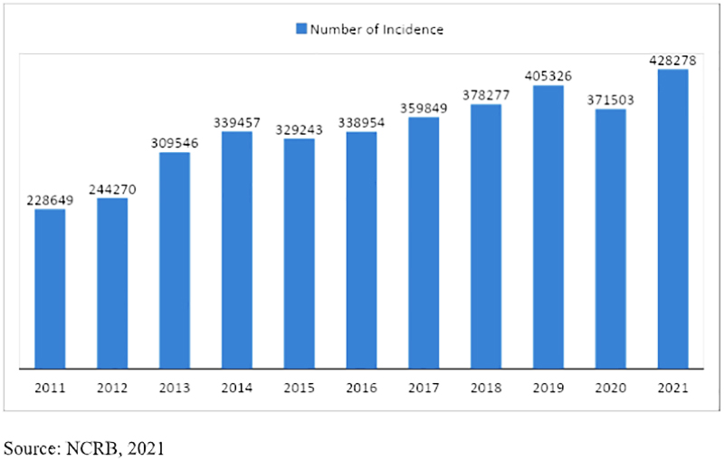 The National crime record Bureau Report, 2021 stated that crime against women cases in the last 11 years has increased by 2,28,649 cases to 4,28,278 cases. On an average, there is a 5.6 percent annual increase in crimes against women. Data from 2020 and 2021 show contradictory results, in 2020, the highest reported crime cases were down by 8.3 percent, while in 2021, reported crime cases were up by 15.3 percent respectively. In 2019–2020, the number of cases dropped from 405326 to 371503, but in 2020-2021, it again rose from 371503 to 428278.