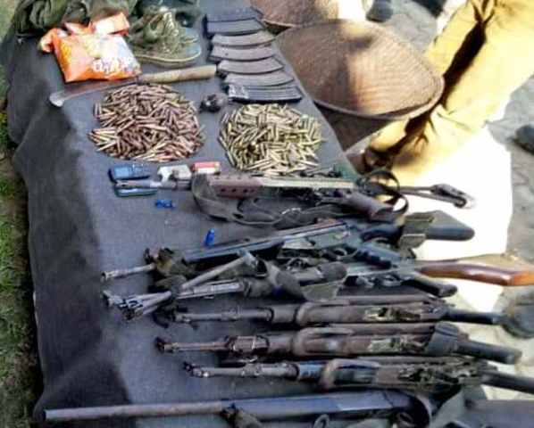 Security personnel recovered three AK-56 rifles, one 12 bore single barrel rifle, one Chinese LMG rifle, two 5.56 mm rifle, one point 22 mm pistol, 308 rounds 5.56 mm ammunition, 361 rounds 7.62 mm ammunition, one Chinese hand grenade and other warlike stores from the area.