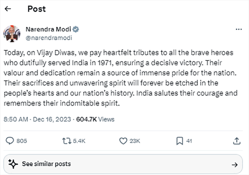 Modi posted on X, "Today, on Vijay Diwas, we pay heartfelt tributes to all the brave heroes who dutifully served India in 1971, ensuring a decisive victory. Their valour and dedication remain a source of immense pride for the nation.