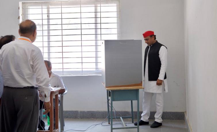 SP chief Akhilesh Yadav, along with his wife Dimple, also exercised their democratic right, after touching feet of Mr Mulayam and his wife Sadhna. Akhilesh later left for Kannauj for campaigning, where his wife is the SP candidate.