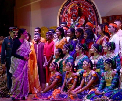The President, Ram Nath Kovind with the artistes who had participated in the 69th Republic Day Parade, at Rashtrapati Bhavan, in New Delhi on January 27, 2018. The Union Minister for Tribal Affairs, Jual Oram and the Ministers of State for Tribal Affairs, Sudarshan Bhagat and Jaswantsinh Sumanbhai Bhabhor are also seen.