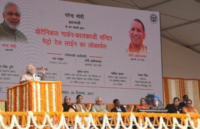 The Prime Minister, Narendra Modi unveiling the plaque to mark inauguration of Botanical Garden-Kalkaji Metro Line at Botanical Garden, in Noida, Uttar Pradesh on December 25, 2017. The Governor of Uttar Pradesh, Ram Naik, the Chief Minister, Uttar Pradesh, Yogi Adityanath, the Minister of State for Culture (I/C) and Environment, Forest & Climate Change, Dr. Mahesh Sharma and other dignitaries are also seen.