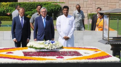 The President, European Council, Mr. Donald Franciszek Tusk and the President, European Commission, Mr.Jean-Claude Juncker paying homage at the Samadhi of Mahatma Gandhi, at Rajghat, in Delhi on October 06, 2017.