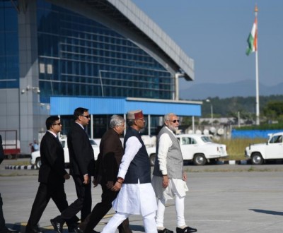 The Prime Minister, Narendra Modi being welcomed by the Governor of Uttarakhand, Dr. K.K. Paul and the Chief Minister of Uttarakhand, Trivendra Singh Rawat, on his arrival, at Dehradun, Uttarakhand on October 20, 2017