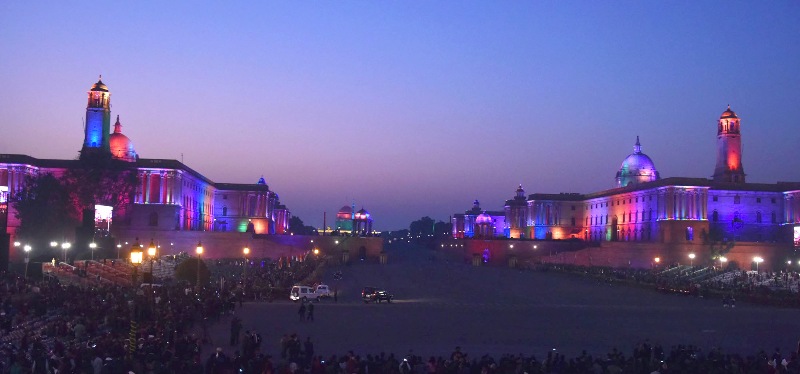 A view of the illuminated Rashtrapati Bhavan, South and North Block, during the ‘Beating Retreat’ ceremony, at Vijay Chowk, in New Delhi on January 29, 2018.