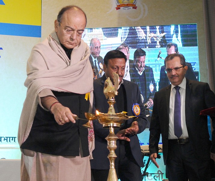 The Union Minister for Finance and Corporate Affairs, Arun Jaitley lighting the lamp at the Platinum Jubilee celebrations (75th Anniversary of Foundation Day) of UCO Bank, in New Delhi on January 06, 2018.