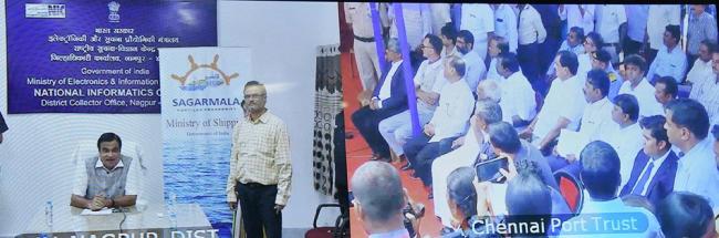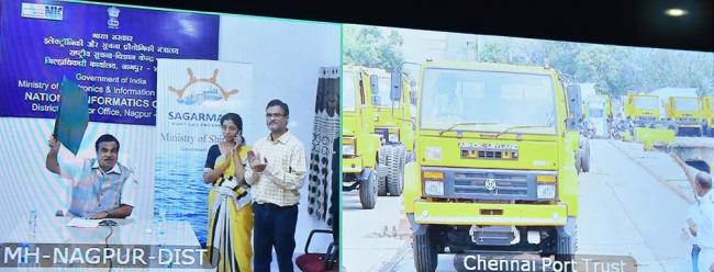 The Union Minister for Road Transport & Highways, Shipping and Water Resources, River Development & Ganga Rejuvenation, Nitin Gadkari digitally flagging off a consignment of 185 trucks sent by RORO coastal shipping from Chennai Port to Mongla Port in Bangladesh, from Nagpur, on October 28, 2017.