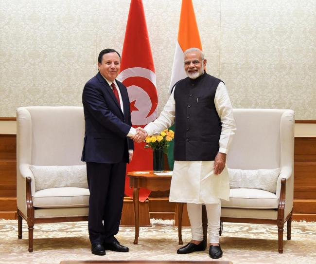 The Foreign Minister of Tunisia, Mr. Khemaies Jhinaoui calling on the Prime Minister, Narendra Modi, in New Delhi on October 28, 2017.