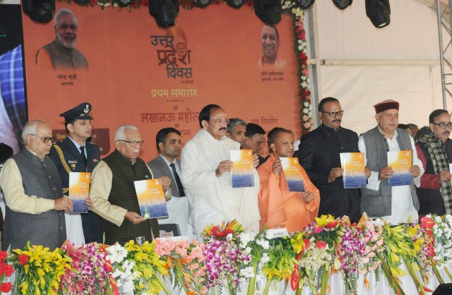 The Vice President, M. Venkaiah Naidu releasing the publication at the Uttar Pradesh Diwas, in Lucknow, Uttar Pradesh on January 24, 2018. The Governor of Uttar Pradesh, Ram Naik, the Chief Minister of Uttar Pradesh, Yogi Adityanath and other dignitaries are also seen.