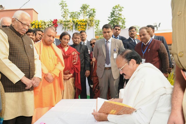 The Vice President, M. Venkaiah Naidu signing the Visitor’s Book at the Exhibition on Uttar Pradesh Diwas, in Lucknow, Uttar Pradesh on January 24, 2018. The Governor of Uttar Pradesh, Ram Naik, the Chief Minister of Uttar Pradesh, Yogi Adityanath and other dignitaries are also seen.