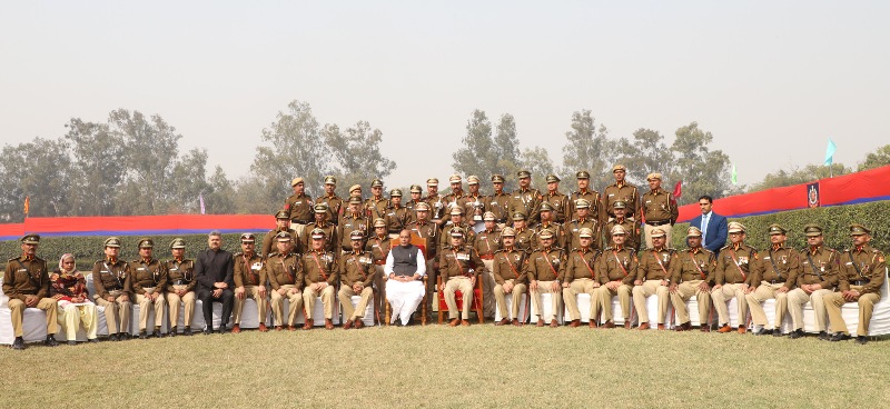 The Union Home Minister, Rajnath Singh in a group photograph with the winners of medals and awards, during the 71st Raising Day Parade of Delhi Police in New Delhi on February 16, 2018.