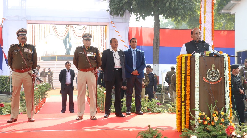 The Union Home Minister, Rajnath Singh addressing the 71st Raising Day Parade of Delhi Police, in New Delhi on February 16, 2018.