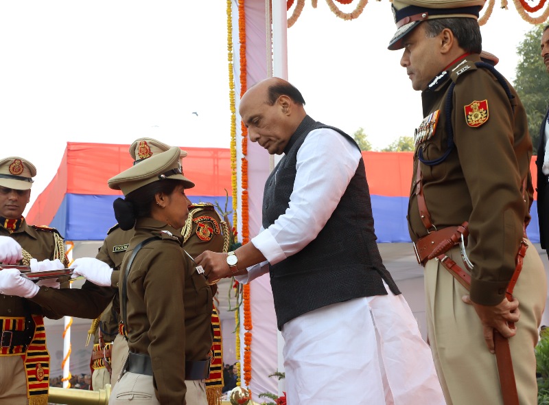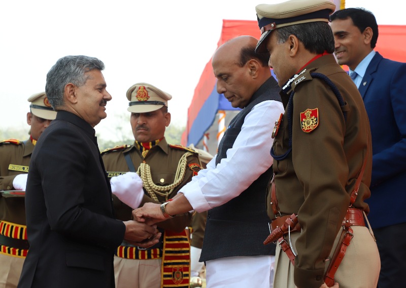 The Union Home Minister, Rajnath Singh giving away medals, during the 71st Raising Day Parade of Delhi Police, in New Delhi on February 16, 2018.