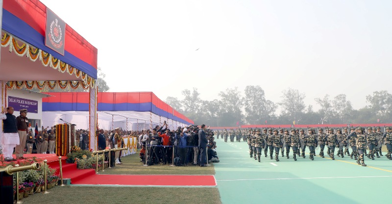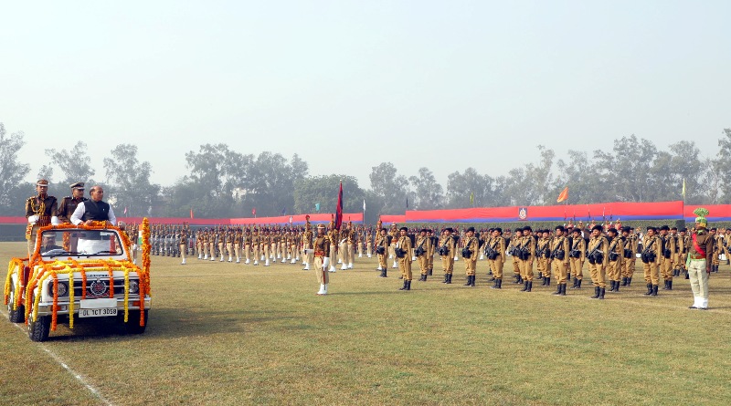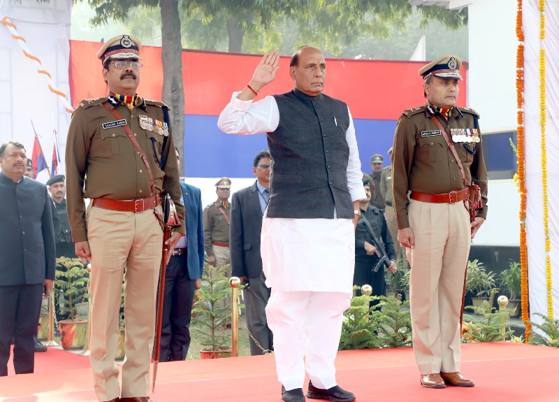 The Union Home Minister, Rajnath Singh inspecting the Parade, during the 71st Raising Day Parade of Delhi Police, in New Delhi on February 16, 2018.