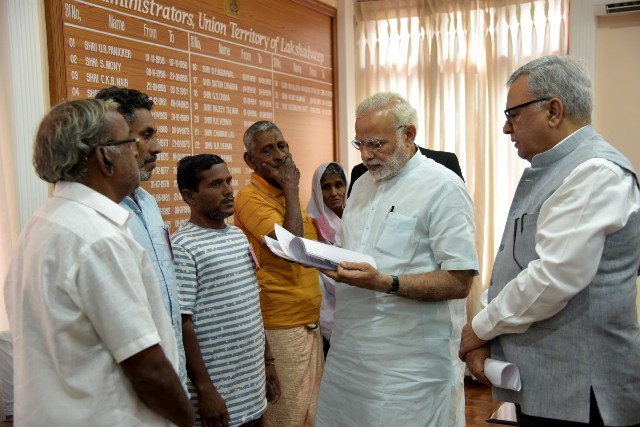 The Prime Minister, Narendra Modi meets the victims of Cyclone Ockhi, in Kavaratti, Lakshadweep on December 19, 201