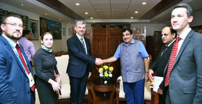 A Russian delegation headed by the first Deputy Minister of Transport of the Russian Federation, Evgeny Ditrikh meeting the Union Minister for Road Transport & Highways, Shipping and Water Resources, River Development & Ganga Rejuvenation, Nitin Gadkari, in New Delhi on November 14, 2017.