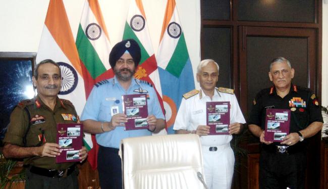 The Chairman Chiefs of Staff Committee & Chief of the Naval Staff, Admiral Sunil Lanba releasing the ‘Joint Training Doctrine Indian Armed Forces - 2017’, in New Delhi on November 14, 2017. The Chief of Army Staff, General Bipin Rawat, the Chief of the Air Staff, Air Chief Marshal B.S. Dhanoa and the Chief of Integrated Defence Staff to the Chairman Chiefs of Staff Committee (CISC), Lt. Gen. Satish Dua are also seen.