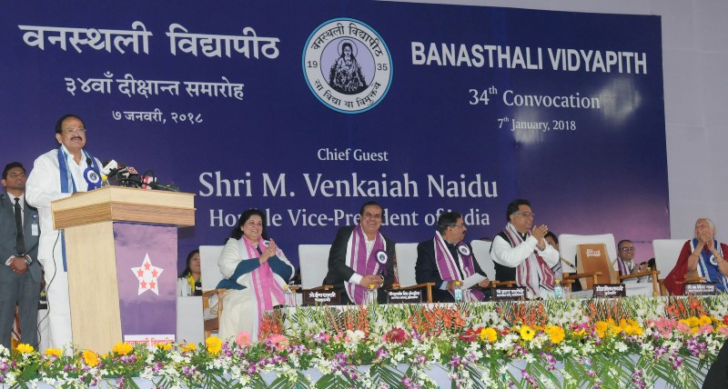The Vice President, M. Venkaiah Naidu addressing the gathering during the 34th Convocation of the Banasthali Vidyapeeth, in Tonk district of Rajasthan on January 07, 2018.