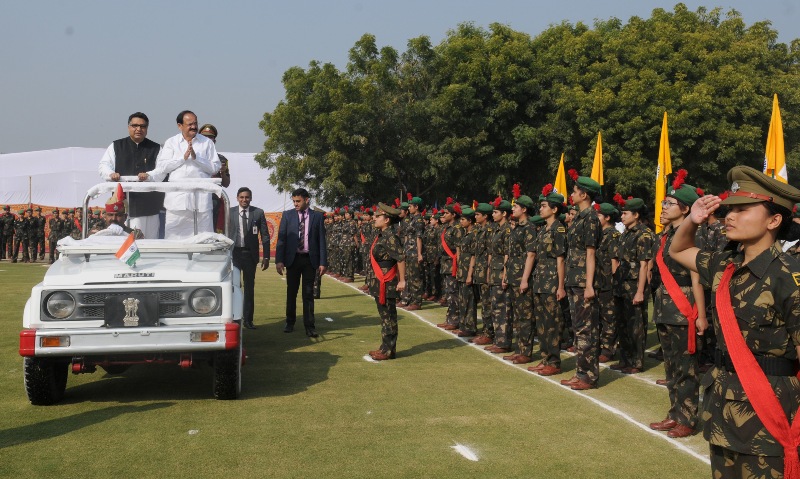 The Vice President, M. Venkaiah Naidu taking the salute of the ceremonial parade on his arrival, at Banasthali Vidyapeeth, in Tonk district of Rajasthan on January 07, 2018.
