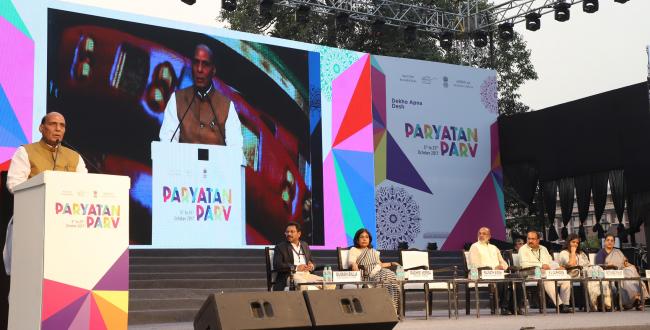The Union Home Minister, Rajnath Singh addressing during the Opening Ceremony of Grand Finale of Paryatan Parv, in New Delhi on October 23, 2017. The Minister of State for Tourism (I/C) and Electronics & Information Technology, Alphons Kannanthanam and the Secretary, Ministry of Culture and Tourism, Rashmi Verma are also seen.