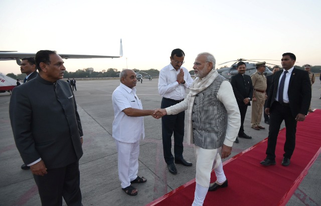 The Prime Minister, Narendra Modi being seen off by the Chief Minister of Gujarat, Vijay Rupani and the Chief Minister of Gujarat, SNitinbhai Patel, on his departure from Ahmedabad on January 17, 2018.