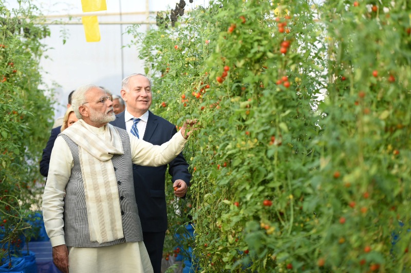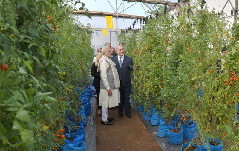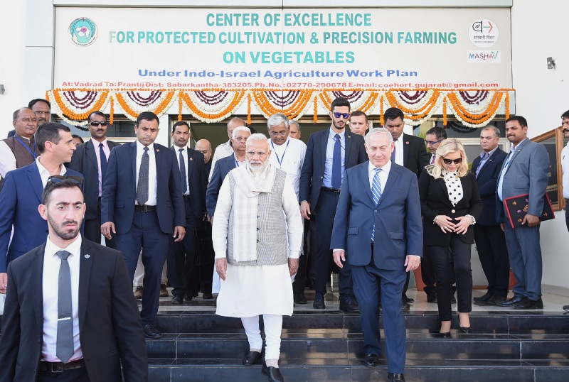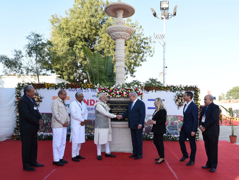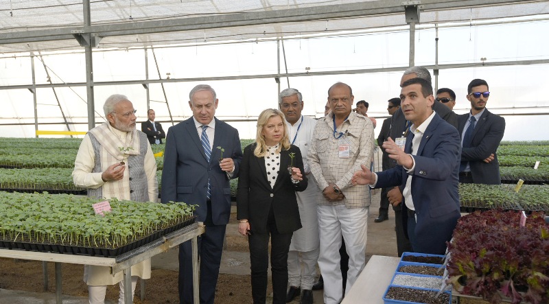 The Prime Minister, Narendra Modi and the Prime Minister of Israel, Benjamin Netanyahu, at the Centre of Excellence for Vegetables, at Vadrad, in Gujarat on January 17, 2018.
