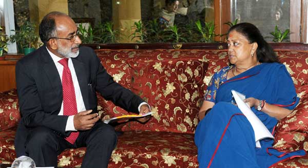 The Chief Minister of Rajasthan, Vasundhara Raje meeting the Minister of State for Tourism (I/C) and Electronics & Information Technology, Alphons Kannanthanam, in New Delhi on November 16, 2017.