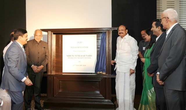 The Vice President, M. Venkaiah Naidu inaugurating the MMA Management Center building, in Chennai on January 17, 2018. The Governor of Tamil Nadu, Banwarilal Purohit is also seen.