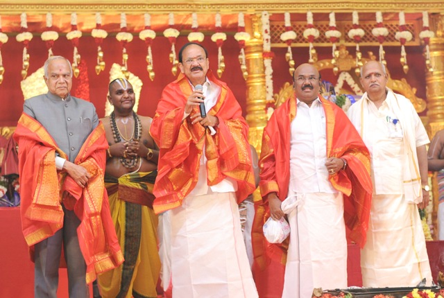 The Vice President, M. Venkaiah Naidu addressing the gathering after attending the Sreenivasa Kalyanam, in Chennai on January 17, 2018. The Governor of Tamil Nadu, Banwarilal Purohit is also seen.