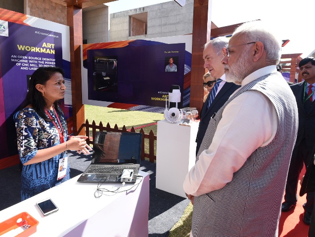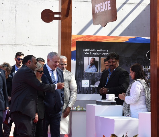 The Prime Minister, SNarendra Modi and the Prime Minister of Israel, Benjamin Netanyahu visiting the Startup Exhibition and interacting with innovators and Startup CEOs at iCreate Center, at Deo Dholera Village, in Ahmedabad, Gujarat on January 17, 2018.