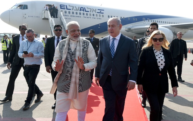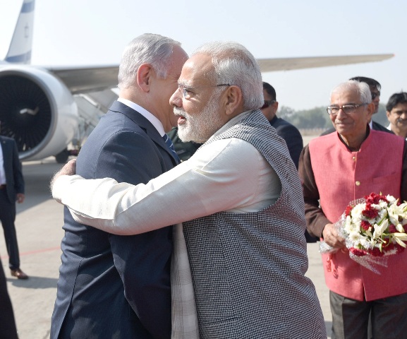 The Prime Minister, Narendra Modi receives the Prime Minister of Israel, Benjamin Netanyahu, on his arrival, at Gujarat on January 17, 2018.