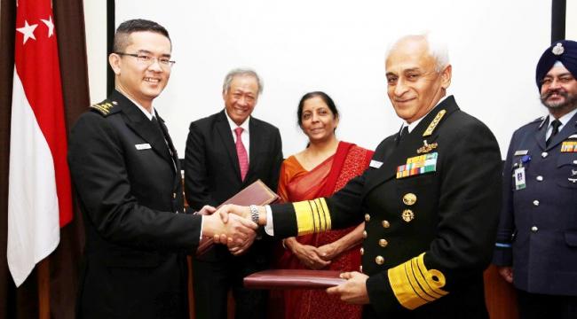 The Chief of Naval Staff, Admiral Sunil Lanba exchanging the signed documents of bilateral agreement with the Naval Chief of Singapore Rear Admiral Lew Chuen Hong, in the presence of the Union Minister for Defence, Nirmala Sitharaman and the Defence Minister of Singapore, Dr. Ng Eng Hen, in New Delhi on November 29, 2017. The Chief of the Air Staff, Air Chief Marshal B.S. Dhanoa is also seen.