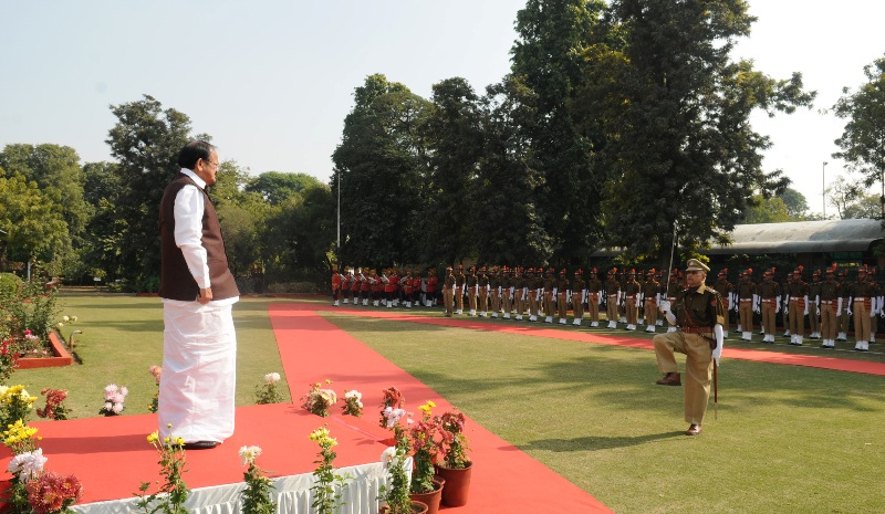 The Vice President, M. Venkaiah Naidu being presented the Guard of Honour, on his arrival, at the Raj Bhawan, in Jaipur on January 06, 2018.