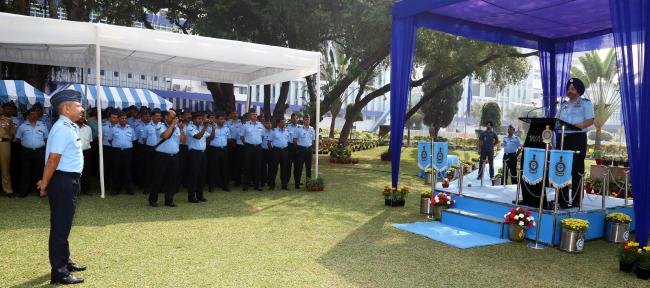 The Chief of the Air Staff, Air Chief Marshal B.S. Dhanoa addressing the personnel in hollow square, prior to his departure from HQ Western Air Command, in New Delhi on October 23, 2017.