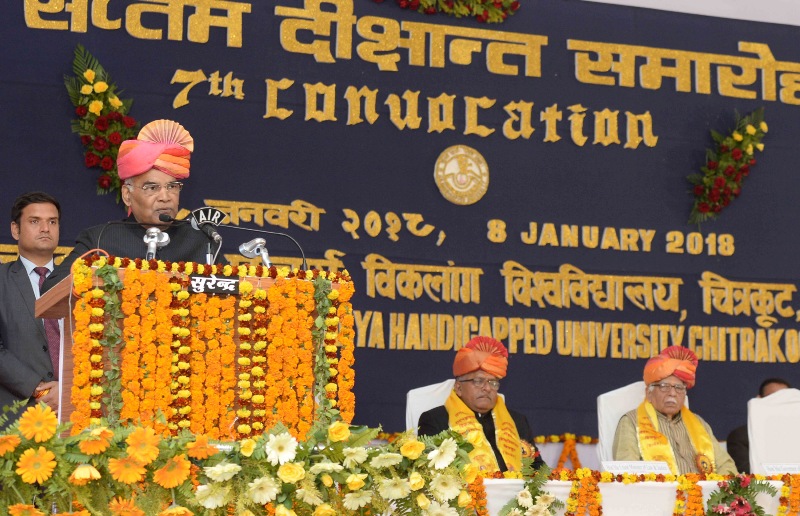 The President, Ram Nath Kovind addressing at the 7th convocation of Jagadguru Rambhadracharya Handicapped University, at Chirakoot, in Uttar Pradesh on January 08, 2018.