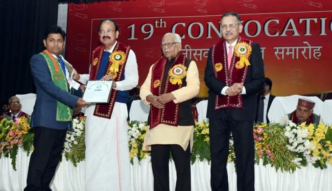 The Vice President, M. Venkaiah Naidu awarding degrees to students at the 19th Convocation of Chandra Shekhar Azad University of Agriculture and Technology, in Kanpur, Uttar Pradesh on December 04, 2017. The Governor of Uttar Pradesh, Ram Naik, the Minister for Agriculture, Uttar Pradesh, Surya Pratap Shahi and other dignitaries are also seen.