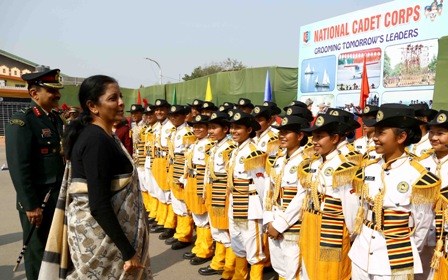 The Union Minister for Defence, Nirmala Sitharaman inspecting the Guard of Honour of NCC cadets, during her visit to the Republic Day NCC Camp 2018, in New Delhi on January 22, 2018. The DG, NCC, Lt. Gen. B.S. Sahrawat is also seen.