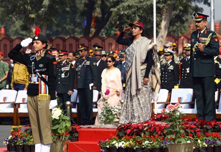The Union Minister for Defence, Nirmala Sitharaman taking salute, during her visit to the Republic Day NCC Camp 2018, in New Delhi on January 22, 2018. The DG, NCC, Lt. Gen. B.S. Sahrawat is also seen.