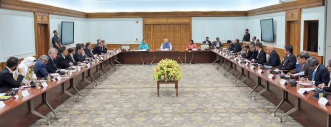 The Prime Minister, Narendra Modi interacting with the Global CEOs of the Food Processing Sector as part of the ongoing World Food India event, in New Delhi on November 03, 2017. The Union Minister for Food Processing Industries, Harsimrat Kaur Badal and the Minister of State for Food Processing Industries, Sadhvi Niranjan Jyoti are also seen.