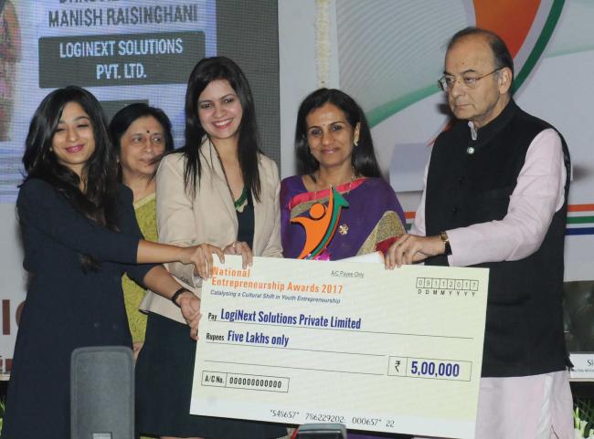 The Union Minister for Finance and Corporate Affairs, Arun Jaitley giving away the National Entrepreneurship Awards 2017, on the occasion of the 3rd Foundation Day of MSDE, in New Delhi on November 09, 2017. The MD and CEO of ICICI Bank, Chanda Kochhar is also seen.