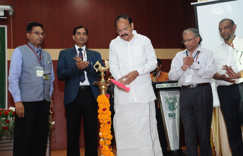 The Vice President of India, M. Venkaiah Naidu lighting the lamp at an event to interact with the Agricultural Researchers on ‘Doubling Farm Income by 2022 in Andhra Pradesh and Telangana’, at ICAR - Indian Institute of Rice Research, in Hyderabad on March 31, 2018.