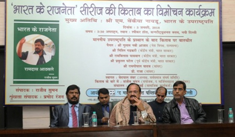 The Vice President, M. Venkaiah Naidu at an event to release the book “Bharat Ke Rajneta - Ramdas Athawale â€, authored by Shri Rajeev Suman, in New Delhi on January 03, 2018. The Minister of State for Social Justice & Empowerment, Ramdas Athawale is also seen.