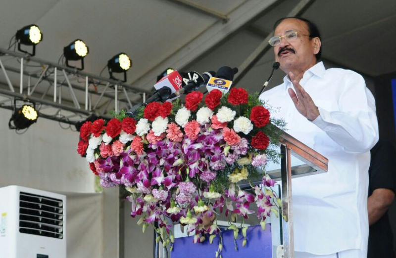 .The Vice President, M. Venkaiah Naidu addressing the gathering at the Golden Jubilee Celebrations of Jagarlamudi Kuppuswamy Choudhary College, in Guntur, Andhra Pradesh on February 03, 2018. The Chief Minister of Andhra Pradesh, N. Chandrababu Naidu and other dignitaries are also seen.