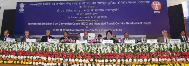 The Vice President, M. Venkaiah Naidu addressing the gathering after laying the foundation stone for the International Exhibition-cum-Convention Center and Integrated Transit Corridor Development Project, at Pragati Maidan, in New Delhi on December 22, 2017. The Union Minister for Commerce, Suresh Prabhu, the Minister of State for Consumer Affairs, Food & Public Distribution and Commerce & Industry, C.R. Chaudhary and the Commerce Secretary, Rita A. Teaotia are also seen