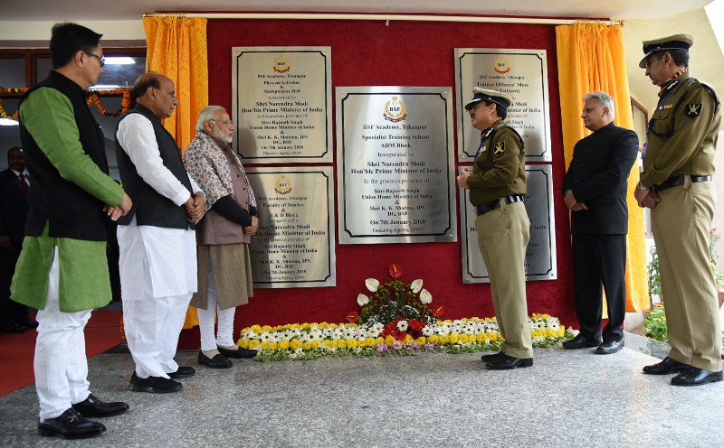 The Prime Minister, Narendra Modi unveiled the plaques to mark the inauguration of five new buildings at the BSF Academy, during the Annual Conference of DGPs and IGPs, at Tekanpur, Madhya Pradesh. on January 07, 2018. The Union Home Minister, Rajnath Singh and the Minister of State for Home Affairs, Kiren Rijiju are also seen.
