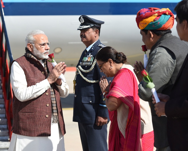 The Prime Minister, Narendra Modi being welcomed by the Chief Minister of Rajasthan, Vasundhara Raje, on his arrival at Uttarlai Air Force Station, in Barmer, Rajasthan on January 16, 2018.