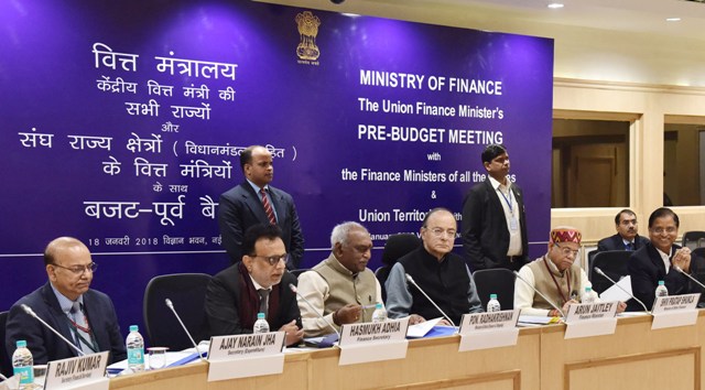 The Union Minister for Finance and Corporate Affairs, Arun Jaitley chairing the Pre-Budget Consultation with the States Finance Ministers in connection with the forthcoming Union Budget 2018-19, in New Delhi on January 18, 2018. The Minister of State for Finance, Shiv Pratap Shukla, the Minister of State for Finance and Shipping, P. Radhakrishnan, the Finance Secretary, Dr. Hasmukh Adhia, the Secretary, Department of Expenditure, Ajay Narayan Jha and the Secretary, Department of Economic Affairs, S.C. Garg are also seen.