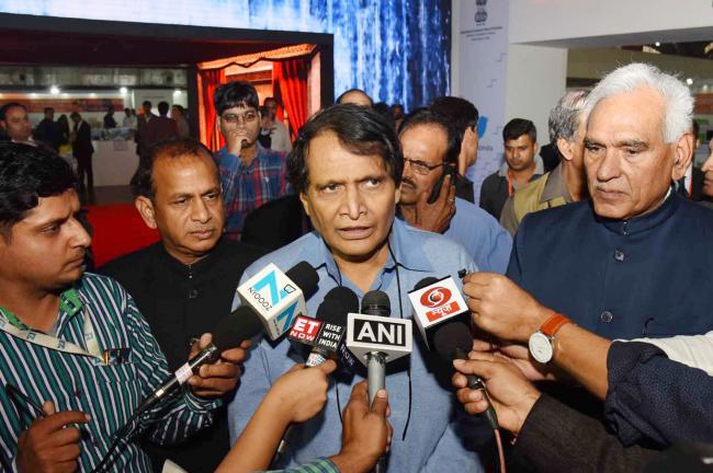 The Union Minister for Commerce & Industry, Suresh Prabhakar Prabhu interacting with the media after inaugurating the Startup India theme pavilion, at the 37th India International Trade Fair (IITF), at Pragati Maidan, in New Delhi on November 14, 2017. The Minister of State for Consumer Affairs, Food & Public Distribution and Commerce & Industry, C.R. Chaudhary and the Secretary, DIPP, Ramesh Abhishek are also seen.